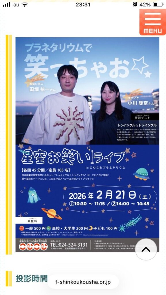 この他全国探してみると自分の知る限りバイオリンやサックス等楽器生演奏・お笑いコラボ・熟睡プログラムなんかもあり、限られた時間の中で様々な企画が安価で楽しめます。皆さんもお近くのプラネタリウムに是非足を運んで頂きたいです!