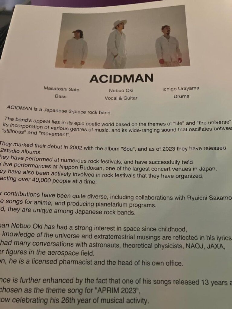 好評を受けシリーズ化、現在第3弾まで投映され全国各地で親しまれています。私は2023年8月20日に第1回目を観ており、ずっと宇宙観・死生観・終末観をその言葉と音楽で表現してきたACIDMANだけに非常に説得力があり、大迫力の映像と音楽のコラボは珠玉のひと時でした